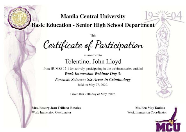 Title of the Seminar/Date and Time: Work Immersion Webinar Day 3: Forensic Science: Six